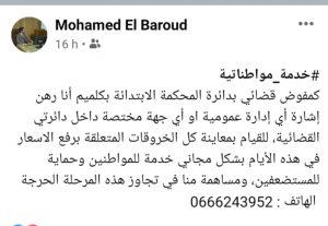 محمد البرود الحائز على أول نقطة في فوج 2017 بالمعهد العالي للقضاء، اختار العمل كمفوض قضائي بجهة كلميم واد نون كتب في هذه تدوينته، أنه سيقوم بهذه الخدمة، “بشكل مجاني خدمة للمواطنين وحماية للمستضعفين ومساهمة منا في تجاوز هذه المرحلة الحرجة”.