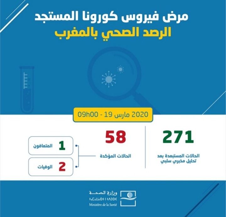 أكدت وزارة الصحة الرأي العام أنه تم ليلة أمس الأربعاء – الخميس وإلى غاية التاسعة والنصف صباحا من يومه الخميس 19 مارس 2020، تسجيل اربع حالات إصابة جديدة مؤكدة بفيروس كورونا المستجد، تم تأكيدها مخبريا بمعهد باستور-المغرب والمختبر الوطني للأنفلونزا والفيروسات التنفسية بالمعهد الوطني للصحة بالرباط، ليكون بذلك العدد الإجمالي للحالات المؤكدة إصابتها بمرض كوفيد-19 هو 58 حالة ببلادنا.