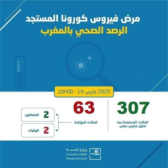 أكدت وزارة الصحة، مساء اليوم الخميس، عن ارتفاع عدد المصابين بشكل مؤكد بـ”كورونا” فيروس إلى 63 حالة بعدما سجلت حالة جديدة مساء اليوم .
