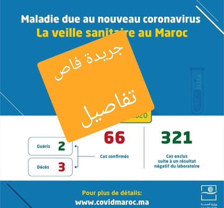 أعلنت وزارة الصحة، على بوابتها الرسمية لفيروس كورونا المستجد بالمغرب “www.covidmaroc.ma” أنه تم ، إلى حد الآن ، تسجيل ثلاث حالات إصابة جديدة مؤكدة بفيروس كورونا المستجد.