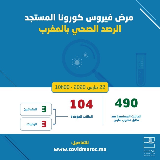 أعلنت وزارة الصحة فى المغرب تسجيل 8 اصابات جديدة لتصل الحصيلة الى 104 حالة إصابة مؤكدة بفيروس كورونا المستجد حتى صباح الأحد ووفاة ثلاثة منها، وأضافت الوزارة أن ثلاثة من المصابين بالفيروس تعافوا من المرض.