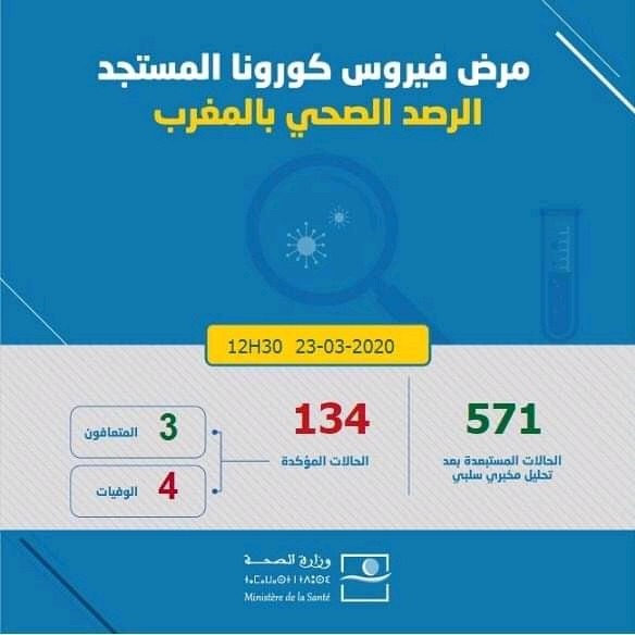 ارتفع عدد حالات الإصابة بفيروس كورونا في المغرب، إلى 134 حالة مؤكدة، بعد زيادة 12 حالة جديدة، حسب ما أوردته وزارة الصحة على موقعها اليوم الاثنين.