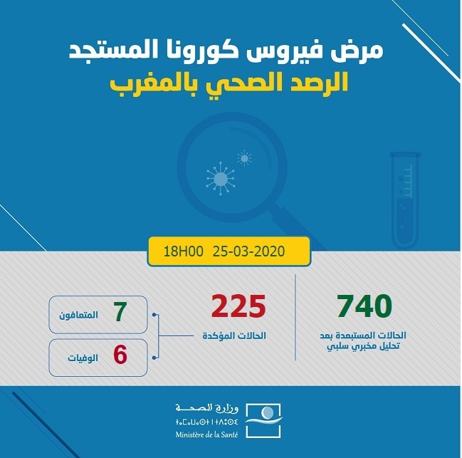 وصلت الحالة الوبائية بالمغرب إلى حدود ساعة السادسة من مساء يوم الأربعاء 25 مارس 2020: