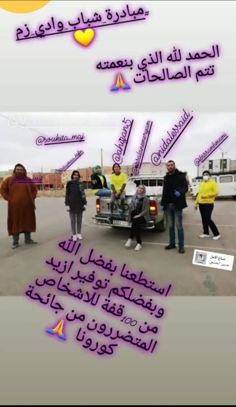 ساهمت مبادرة شباب وادي زم في ترسيخ ثقافة التضامن والتازر مع الفئات الهشة في كل المناسبات التي تكون فيها محتاجة الى العون والدعم الاجتماعي، وتتكون من خيرة شباب وادي زم ، هي نخبة مثقة وتعي بمسؤولية التعاطي مع تلك المناسبا ت الاجتماعية والدينية بكل إيجابية،وهو ما دفعهم الى مساعدة الأسر المعوزة في سياق الحملات التضامنية التي شاعت بشكل ملفت بمدينة وادي زم من قبل حمعيات مدنية ضد وباء كورونا ،فقد ساهموا ب100قفة لفائدة المستخدمين الذين توقفوا عن عملهم قهرا بسبب وباء كرونا في المعامل والمقاهي وغيرها ،كماقاموا بتوزيع الكمامات على مجموعة من المواطنين، وهي التفاتة مواطنة من قبل شباب واع بدوره الحيوي في المجتمع ،في لحظة تتطلب التعبئة الشاملة من قبل الجميع ،حيث تسلموا تلك المساعدات من مجموعة من المحسنين الذين برهنوا عن دعمهم وتضامنهم مع هذه الشريحة بمدينة الشهداء.