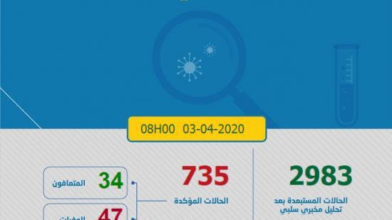 وأضافت الوزارة، على بوابتها الرسمية الخاصة بفيروس كورونا المستجد بالمغرب “www.covidmaroc.ma”، أن عدد حالات الوفيات ارتفع إلى 47 بعد تسجيل ثلاث حالات جديدة، فيما بلغ عدد الحالات المستبعدة بعد تحليل مخبري سلبي 2983 حالة.
