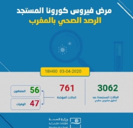 كشفت وزارة الصحة عن آخر مستجدات الوضعية الوبائية بالمغرب إلى غاية السادسة من مساء الجمعة 03 أبريل
