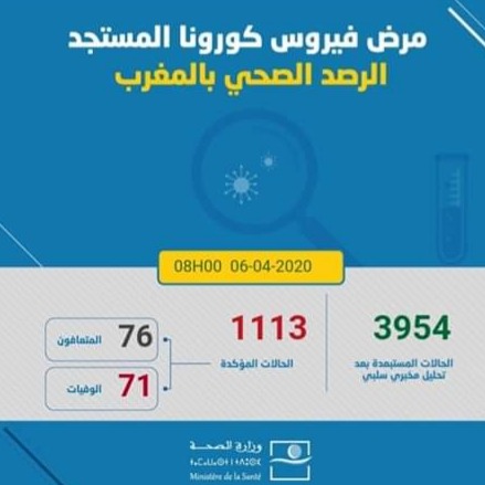 وبلغ عدد الحالات المستبعدة، بعد تحاليل مختبرية سلبية، 3954 منذ بداية انتشار الفيروس في المغرب، كما تم تسجيل حالة وفاة واحدة جديدة ليصل العدد الإجمالي للوفيات إلى 76 حالة، بينما استقر عدد المتعافين في 76 حالة.