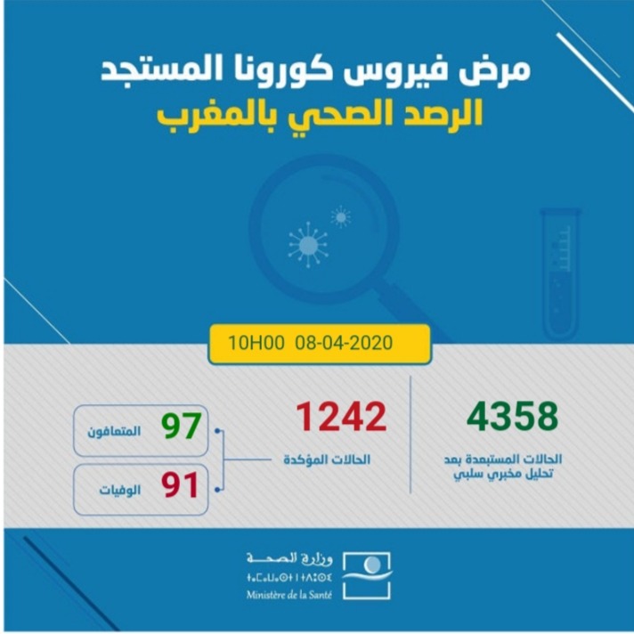 بلغ العدد الإجمالي للمصابين بفيروس كورونا يومه صباح الأربعاء 08 أبريل 2020، 1242حالة مؤكدة، بعد تسجيل 58 حالة إصابة جديدة بالفيروس خلال الفترة المذكورة، في حين تم استبعاد 4358حالة بعد تحاليل مخبرية سلبية، كما تم تسجيل حالة وفاة جديدة خلال نفس الفترة، ليرتفع بذلك إجمالي الوفيات إلى 91 حالة وفاة، وبالمقابل، تم تسجيل 04 حالات شفاء جديدة، ليرتفع إجمالي حالات التعافي إلى 97 حالة.