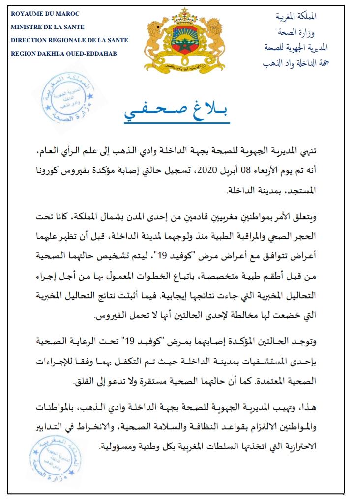 تنهي المديرية الجهوية للصحة بجهة الداخلة وادي الذهب الى علم الرأي العام، أنه تم اليوم الأربعاء 08 أبريل 2020، تسجيل حالتي إصابة مؤكدة بفيروس كورونا المستجد، بمدينة الداخلة.