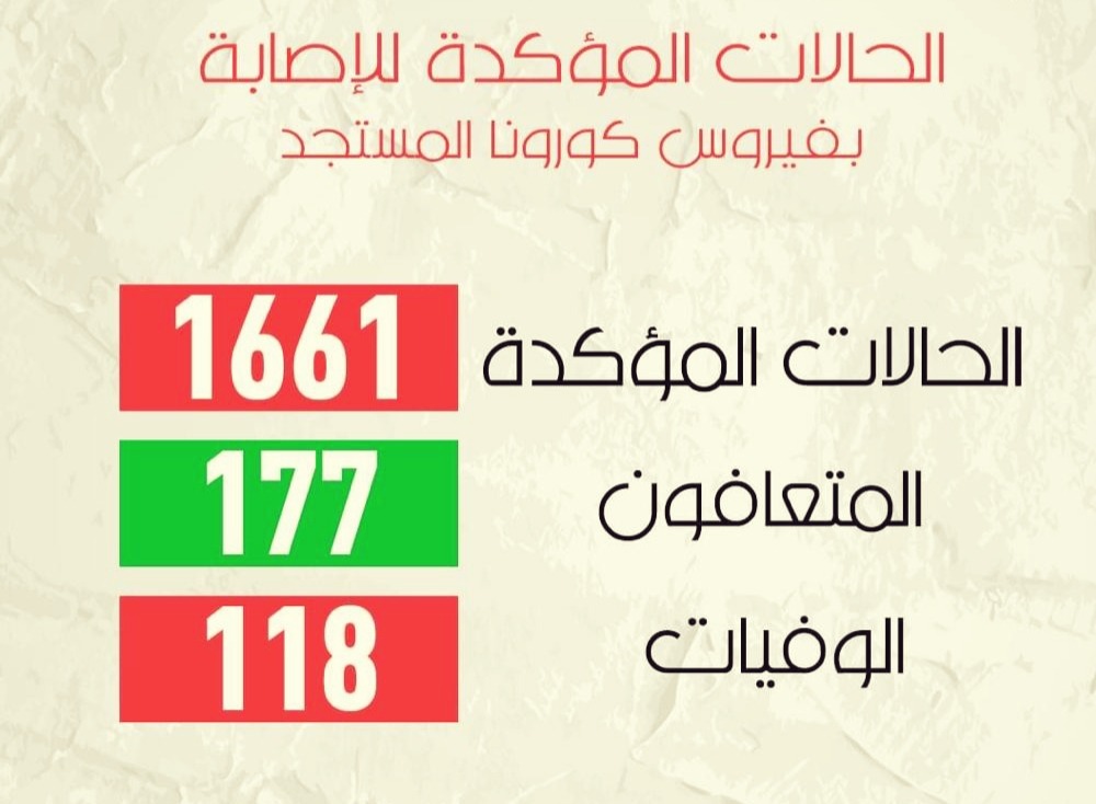 وبلغ عدد الوفيات 118 حالة وفاة، بزيادة 7 حالات، وبلغ عدد المتعافين 177 بعدما تماثلت 31 حالة جديدة للشفاء، و بالمقابل، تم استبعاد 6540 حالة.