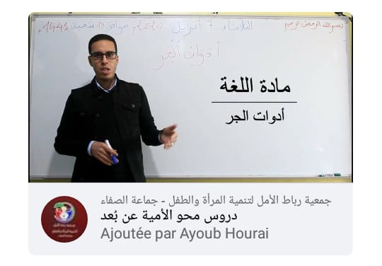 نظرا لما يعيشه المغرب كباقي دول العالم من انتشار وباء كورونا المستجد، وايمانا منها بأهمية التعليم في حياة الإنسان، تعمل جمعية رباط الأمل لتنمية المرأة والطفل الكائن مقرها بدوار “إدازن” جماعة الصفاء ـ اقليم اشتوكة ايت باها، وبإشراف من جمعية الأمل للتنمية والتعاون، في إطار المسؤولية الإجتماعية، على إنجاح مبادرة قيّمة بأبعادها التربوية والتعليمية، تَكْمُن في بث دروس يومية للتعليم عن بُعد، مستثمرة في ذلك كل الوسائل الالكترونية الحديثة، وتهدف الى تقديم حصص دراسية مُصوّرة بشكل يومي للمستفيدين والمستفيدات من برنامج محو الأمية التابع للوكالة الوطنية لمحاربة الأمية.