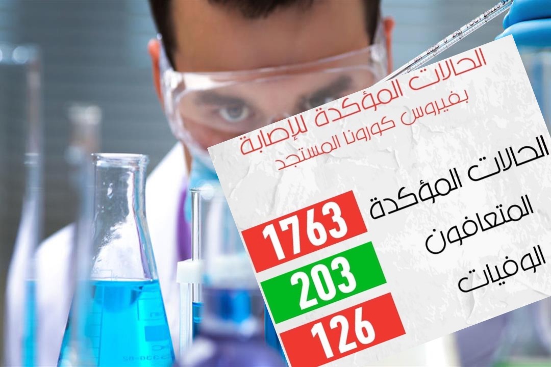 أكدت وزارة الصحة أنه إلى حدود الساعة السادسة مساء تم تسجيل 102 حالة إضافية مؤكدة الإصابة بفيروس كورونا المستجد خلال24ساعة الماضية، لترتفع الحصيلة إلى 1763 حالة.