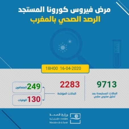 أكدت وزارة الصحة أنه إلى حدود الساعة السادسة مساء تم تسجيل259 حالة إضافية مؤكدة الإصابة بفيروس كورونا المستجد خلال24ساعة الماضية، لترتفع الحصيلة إلى 2283 حالة.