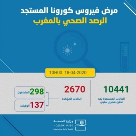 أكدت وزارة الصحة أنه إلى حدود الساعة السادسة مساء تم تسجيل 106 حالة إضافية مؤكدة الإصابة بفيروس كورونا المستجد خلال24ساعة الماضية، لترتفع الحصيلة إلى 2670 حالة.