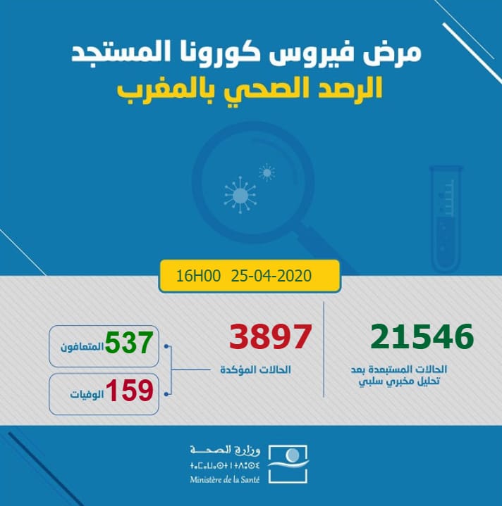 أكدت وزارة الصحة أنه إلى حدود الساعة الرابعة مساء تم تسجيل 139 حالة إضافية مؤكدة الإصابة بفيروس كورونا المستجد خلال 22 ساعة الماضية. ليصل العدد الإجمالي الى 3897 حالة .