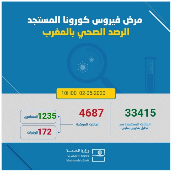 وبلغ عدد الحالات المستبعدة، بعد تحاليل مختبرية سلبية، 33415 منذ بداية انتشار الفيروس بالبلاد، وإلى حدود الساعة العاشرة من صباح اليوم .كما تم تسجيل، 152 حالة شفاء جديدة، ليصل مجموع المتعافين: 1235 و 01 حالة وفاة جديدة، مجموع الوفيات: 172