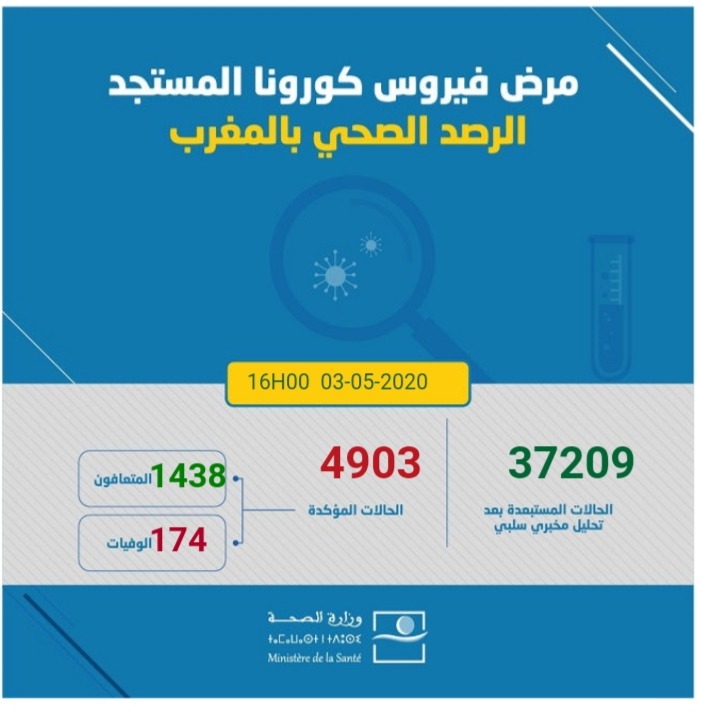 أكدت وزارة الصحة أنه إلى حدود الساعة السادسة مساء تم تسجيل 174 حالة إضافية مؤكدة الإصابة بفيروس كورونا المستجد خلال24ساعة الماضية. ليصل العدد الإجمالي الى 4903 حالة .