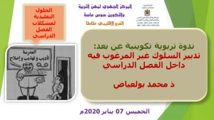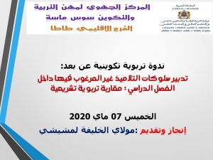 طاطا : ندوة تربوية تفاعلية عن بعد بالفرع الإقليمي للمركز الجهوي لمهن التربية والتكوين حول تدبير السلوكات غير المرغوب فيها داخل الفصل الدراسي