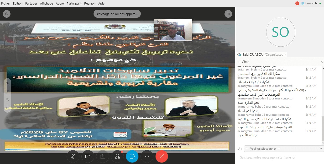 نظم المركز الجهوي لمهن التربية والتكوين سوس ماسة الفرع الإقليمي طاطا ندوة تربوية تكوينية عن بعد ليلة يوم الخميس 07 ماي 2020 في موضوع : تدبير السلوكات غير المرغوب فيها داخل الفصل الدراسي : مقاربة تربوية تشريعية”، أطرها الأستاذان المكونان بالفرع الاقليمي محمد بولعياض ومولاي الخليفة لمشيشي، وكانت بتسيير وتنشيط الأستاذ المكون سعيد أوعبو أستاذ تكنولوجيا المعلومات والاتصال في التعليم، هذه الندوة تنظم لأول مرة بالفرع الإقليمي بتقنية الفيديو التفاعلي المباشرvisioconférence بمشاركة الأساتذة المكونين والأستاذات المتدربات والأساتذة المتدربين فوج 2020 وهي الندوة الثانية في في سلسلة الندوات التربوية المبرمجة في إطار الأنشطة التكوينية الموازية خلال الستنة التكوينية الحالية بعد تنظيم الندوة التربوية التكوينية الأولى في موضوع “نظريات التعلم وتطبيقاتها التربوية” والتي سبق أن أطرها مجموعة من السادة المفتشين التربويين بفضاء الفرع الإقليمي يوم 17 فبراير 2020م، انطلقت الندوة التربوية الثانية على الساعة العاشرة والنصف ليلا بعد التحاق المشاركين بقاعة العروض الافتراضية بكلمة تقديمية لمسير الجلسة ذ سعيد أوعبو، ثم كلمة افتتاحية باسم إدارة الفرع الإقليمي رحب فيها مدير الفرع الإقليمي بكل المشاركين الذين يتفاعلون مع هذا النشاط التربوي الذي ينظم في ظل الحجر الصحي والطوارئ الصحية التي تعرفها بلادنا بسبب جائحة كوفيد19، منوها بمجهودات وتضحيات الأساتذة المكونين من خلال حصص التكوين عن بعد أومن خلال الأنشطة التكوينية الموازية.