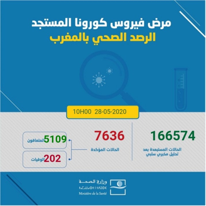 أكدت وزارة الصحة، قبل قليل عبر بوابتها الخاصة بالحالة الوبائية بالمغرب، تسجيل 35 إصابة مؤكدة جديدة بفيروس كورونا المستجد، منذ الساعة السادسة من مساء أمس الأربعاء إلى العاشرة من صباح اليوم 28 ماي 2020، ليرتفع العدد الإجمالي بالمملكة إلى 7636حالة.