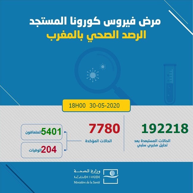 اكدت وزارة الصحة انه تم تسجيل 66 حالة إصابة جديدة بفيروس كورونا خلال 24ساعة الأخيرة، ليصبح بذلك أجمالي الحالات المؤكدة 7780 ، كما بلغ مجموع الحالات المستبعدة: 192218 و سجلت 130 حالة شفاء جديدة, ليصل مجموع المتعافين: 5401 متعافي، تم تسجيل02 حالة وفاة جديدة، لينتقل مجموع الوفيات: 204 وفاة.