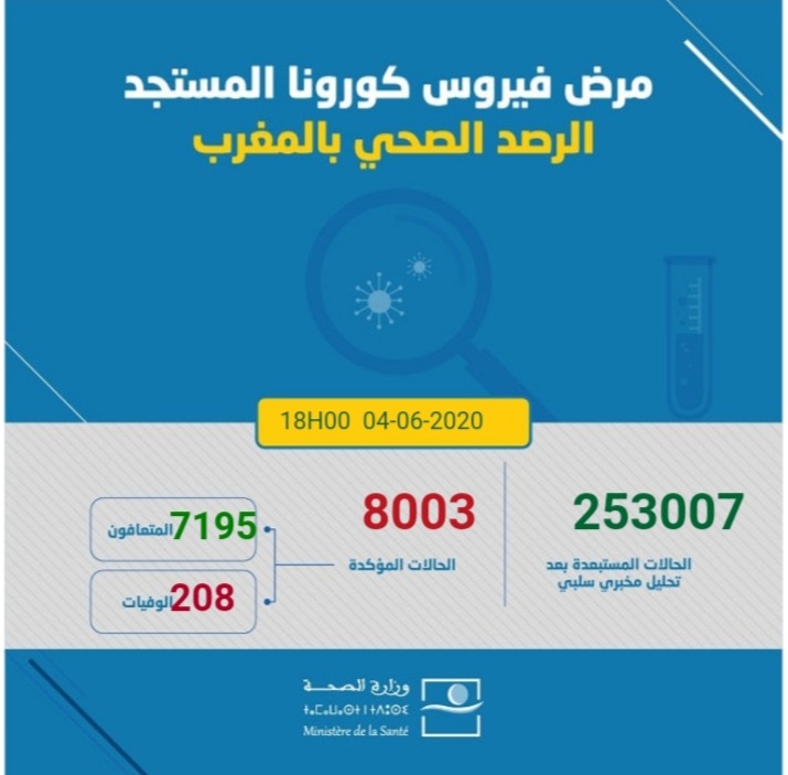 اكدت وزارة الصحة انه تم تسجيل 81 حالة إصابة جديدة بفيروس كورونا ليصبح بذلك أجمالي الحالات المؤكدة 8003 ، كما بلغ مجموع الحالات المستبعدة: 253007 و سجلت 329 حالة شفاء جديدة، ليصل مجموع المتعافين: 7195 متعافي، تم تسجيل 02 حالة وفاة جديدة، ليصل مجموع الوفيات: 208 وفاة ، أما مجموع الحالات التي تتلقى العلاج: 600