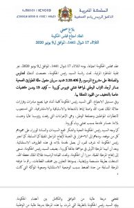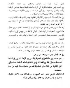 1. تمديد مدة سريان حالة الطوارئ الصحية وذلك من يوم الأربعاء 10 يونيو في الساعة السادسة مساء إلى غاية يوم الجمعة 10 يوليوز 2020 في الساعة السادسة مساء، والتي تمكن الحكومة من اتخاذ تدابير استثنائية للحد من تداعيات هذا الوباء على عدة مستويات.