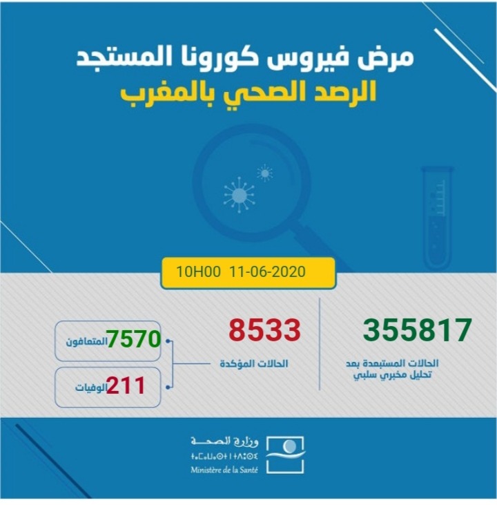 أكدت وزارة الصحة عن الحصيلة الجديدة للإصابات المؤكدة بفيروس كورونا بالمغرب، حيث ارتفعت لتصل إلى 8533 حالة، بعد تسجيل 25 إصابة مؤكدة جديدة، من الساعة السادسة بعد مساء الأربعاء 10 يونيو، إلى غاية الساعة العاشرة من صباح الخميس 11 يونيو.