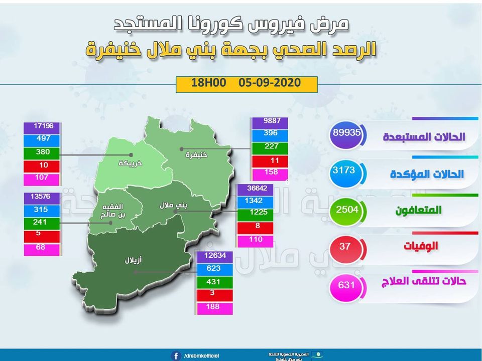 سجلت 88 حالة مؤكدة جديدة منها 18 حالة باقليم بني ملال ;و21 حالة باقليم الفقيه بن صالح , و18 حالة باقليم خنيفرة; و10 حالات باقليم خريبكة و21 حالة باقليم ازيلال ،ليبلغ إجمالي الحالات المؤكدة بالجهة 3173 حالة.