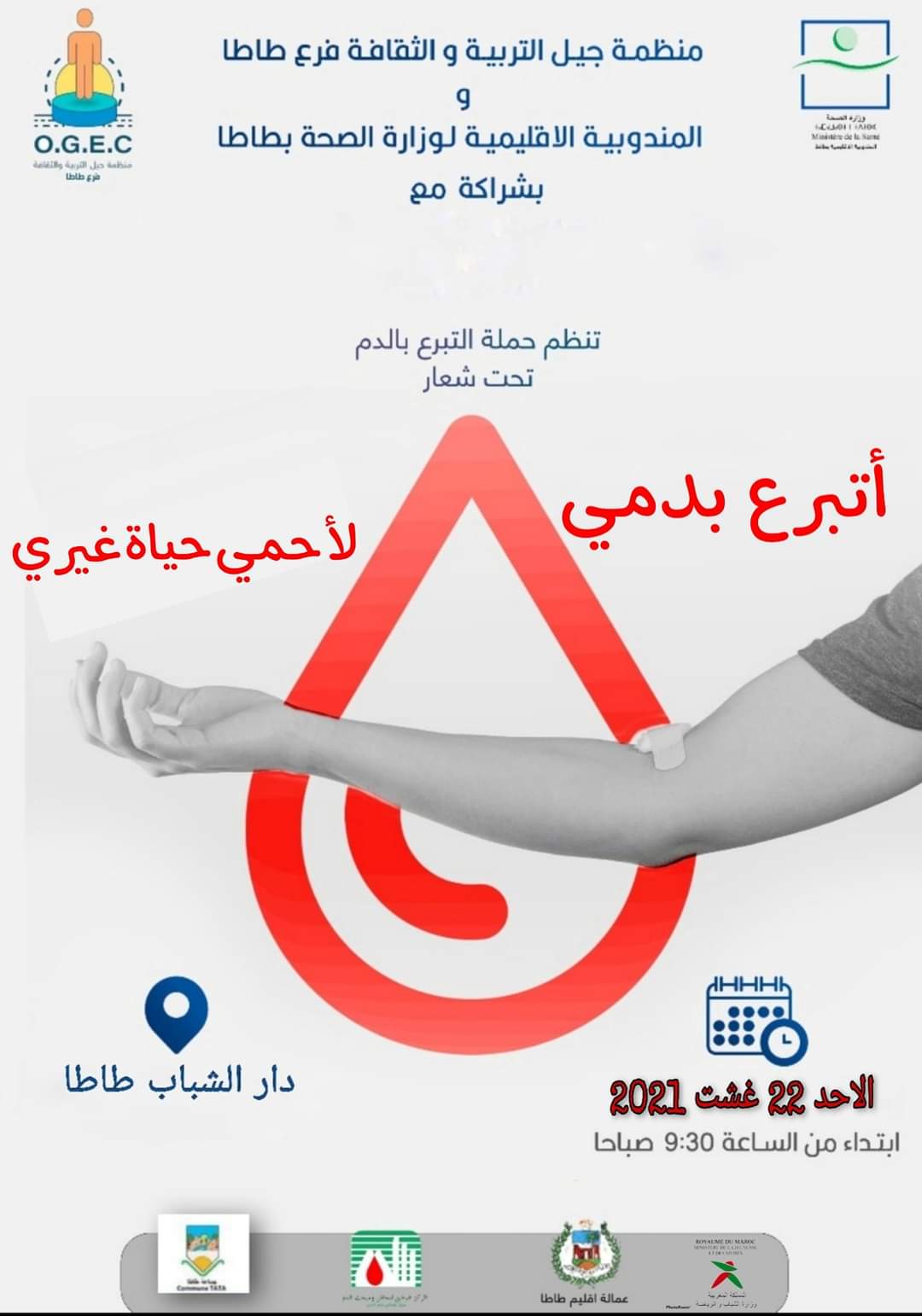 نظرا للخصاص المهول للدم ، الذي يشهده اقليمنا العزيز اقليم طاطا، في هذه الجائحة التي نمر بها . تنظم منظمة جيل التربية و الثقافة _فرع طاطا_ بشراكة مع مندوبية وزارة الصحة طاطا حملة تبرع بالدم، يوم الاحد 22 غشت 2021 بدار الشباب طاطا ابتداء من 9h مع اتخاذ التدابير الوقائية للحماية من كوفيد 19 فعلى الراغبين بالتبرع بقطرة دم و انقاذ الارواح البريئة .