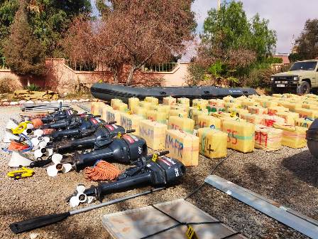 وأضاف المصدر ذاته أن عمليات التفتيش المنجزة بضيعة تبعد بحوالي 17 كيلومتر شمال مدينة السمارة في اتجاه طانطان، مكنت من حجز شحنة أولى من المخدرات معبأة في 114 رزمة من مخدر الشيرا، فضلا عن ثلاثة زوارق مطاطية، ومحركين، وتسع حاويات سعة 60 لترا مملوءة بالبنزين، بالإضافة إلى سيارة رباعية الدفع ومجموعة من خراطيش الصيد.