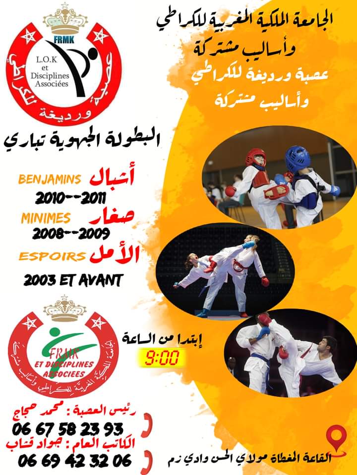 نظمت عصبة ورديغة للكراطي وأساليب مشتركة تحت إشراف الجامعة الملكية البطولة الجهوية اليوم الأحد 6مارس2022 بالقاعة المغطاة مولاي الحسن بوادي زم بمشاركة 15جمعية من خريبكة ووادي زم وأبي الجعد وبوجنيبة وحطان و95مشاركة ومشارك في فئة الصغار والفتيان والأشبال ذكور واناث اضافة الى ذوي الاحتياجات الخاصة تشجيعا لهم على الاندماج والمنافسة.
