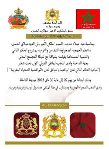 وذلك بمناسبة عید میلاد صاحب السمو الملكي الامير ولي العهد مولاي الحسن ، ابتداءا من يوم 27 إلى غاية 30 ماي 2022 بمدينة الداخلة وسيشارك في هذا الملتقى عدة دول أوروبية وإفريقية وعربية .