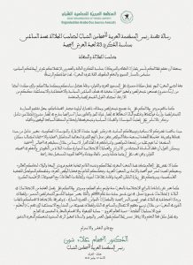 وأضاف الشون في رسالته ” كما لا يخفى على العالم صدق محبة الشعب المغربي لجلالتكم وتشبته الدائم بتجديد تقديم فروض البيعة والولاء لمقامكم العالي، وسعيكم الحثيث لنشر قيم المحبة والإخاء بين الشعوب العربية، وتضامنكم الدائم مع قضايا الوطن العربي، ودعمكم المتواصل للقضية الفلسطينية، وحرصكم على زيارة البلدان العربية وإقامة علاقات أخوية، وإعادة بناء العلاقات مع المجموعات الإقليمية الكبرى”