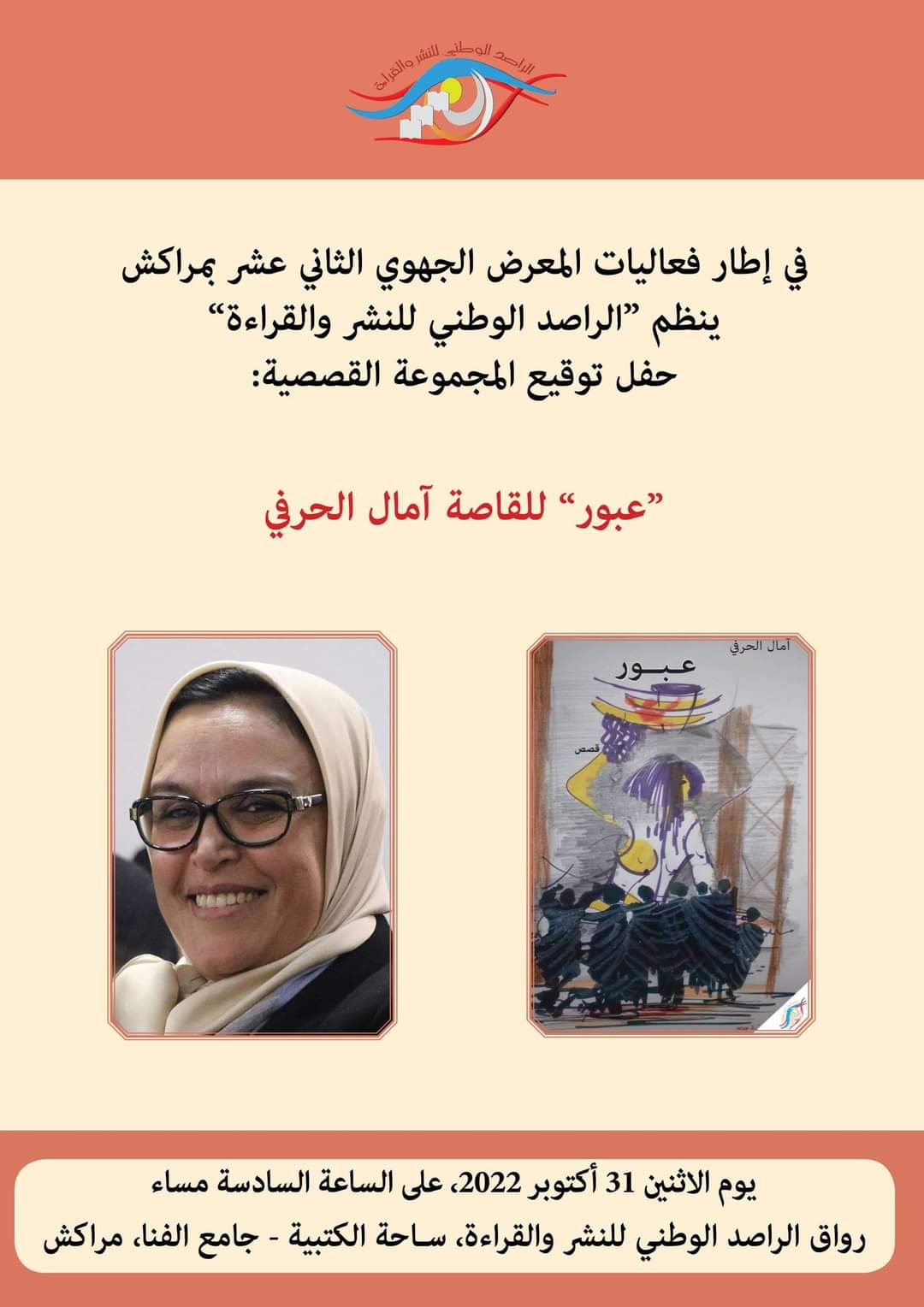 على هامش تنظيم فعاليات المعرض الجهوي الثاني عشر للكتاب بمراكش، حيث سيحتفي الراصد الوطني للنشر والقراءة بالمجموعة القصصية “عبور” للقاصة آمال الحرفي، يوم الاثنين 31 أكتوبر 2022، على الساعة السادسة مساء، برواق “رونق”، فضاء المعرض – ساحة الكتبية – جامع الفنا – بمدينة مراكش .