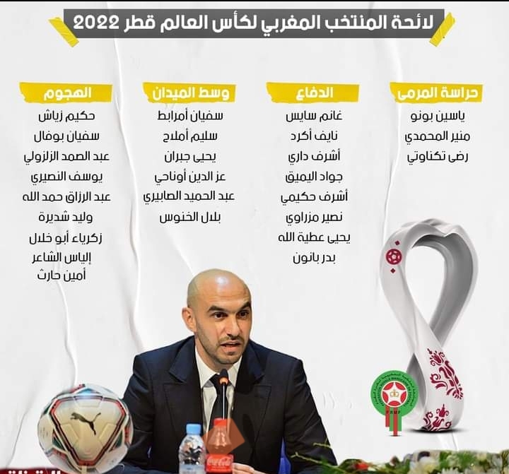 أفرج الناخب الوطني وليد الركراكي ،اليوم الخميس بمركب محمد السادس لكرة القدم بالمعمورة، عن اللائحة النهائية ل “أسود الأطلس” التي ستشارك في كأس العالم ” قطر 2022 ” ، والتي تميزت بعودة المهاجم عبد الرزاق حمد الله لاعب الاتحاد السعودي .