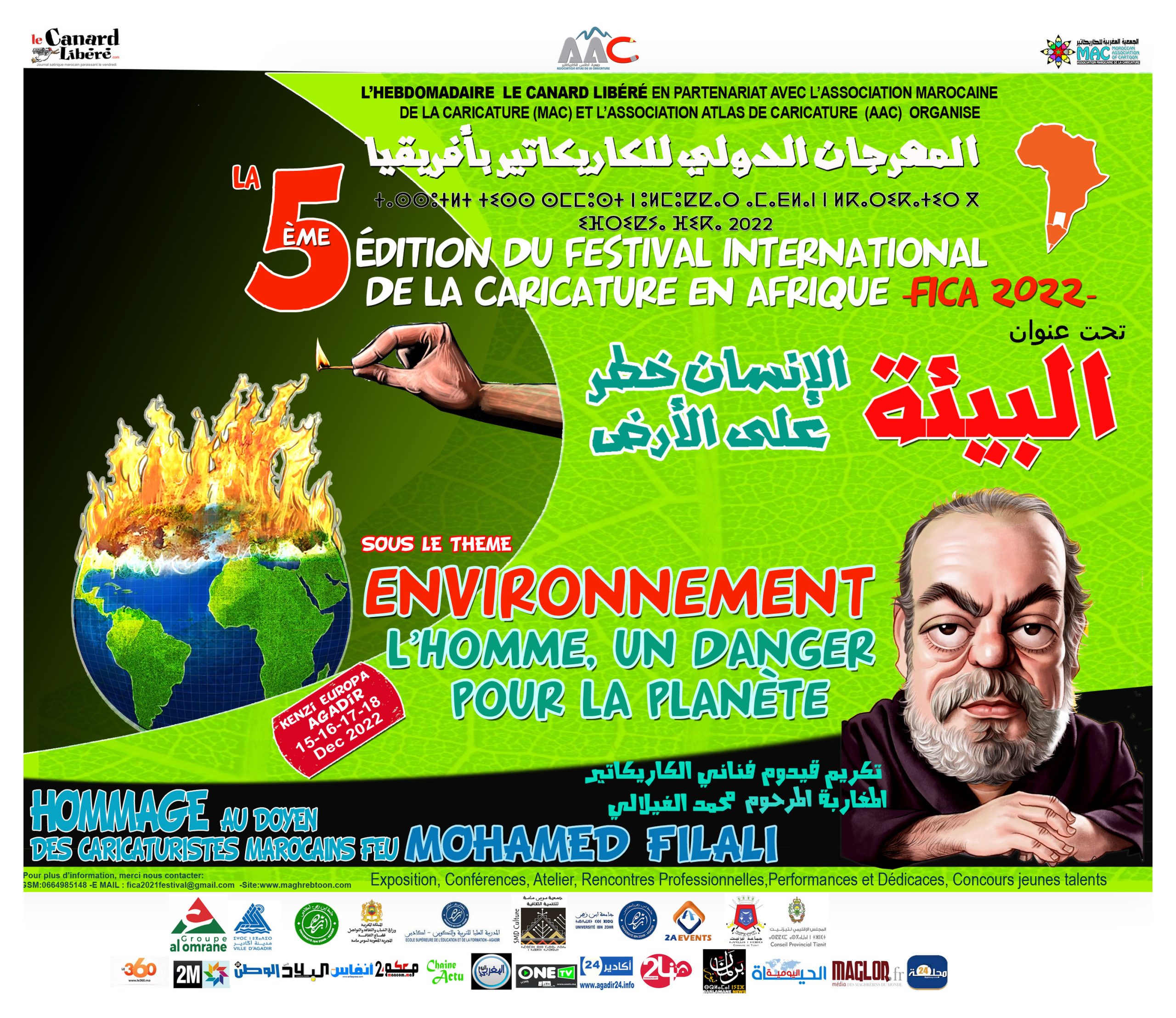 تنطلق في مدينة أكادير فعاليات الدورة الخامسة للمهرجان الدولي للكاريكاتير بإفريقيا إبتداء من 15 دجنبر 2022 وإلى غاية 18 من نفس الشهر ، وذلك تحت إشراف الأسبوعية الساخرة الناطقة باللغة الفرنسية ” le canard libéré وبشراكة مع الجمعية المغربية للكاريكاتير Mac، وجمعية أطلس للكاريكاتير دورة هاته السنة اختير لها كموضوع ” الإنسان خطر على البيئة ” وذلك لما يمثله هذا الموضوع من أهمية بالغة في الوقت الراهن جعلته يستأثر بالحيز الأعظم من انشغال المنظمات والمسؤولين العالميين .