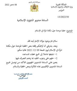 وجهت وزارة الاوقاف والشؤون الاسلامية خطبة موحدة الى مندوبي الشؤون الاسلامية بالمدن ليوم غد الجمعة 9 دجنبر 2022 حول مكانة المرأة في الاسلام وذلك لاعتمادها دون زيادة او نقصان .وفي مايلي نص الخطبة: