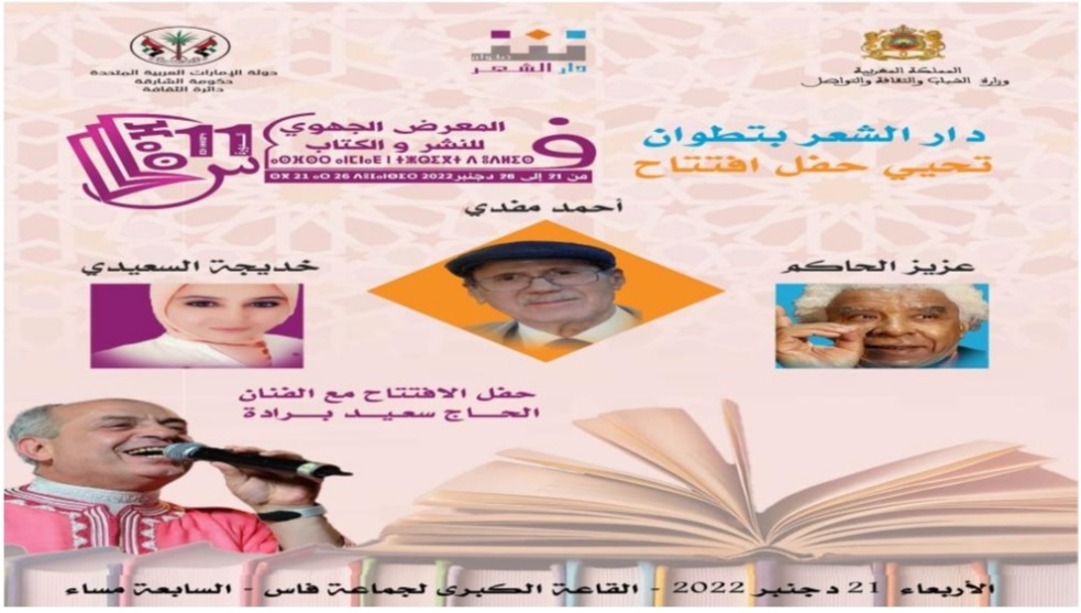 ستفتتح دار الشعر بتطوان فعاليات المعرض الجهوي للنشر والكتاب في مدينة فاس، يوم الأربعاء 21 دجنبر الجاري، ابتداء من الساعة السابعة مساء، بفضاء القاعة الكبرى لجماعة فاس. وبعد الافتتاح الرسمي لهذا المعرض الجهوي العريق، الذي تنظمه المديرية الجهوية لوزارة الشباب والثقافة والتواصل، قطاع الثقافة، تنطلق الاحتفالية بأمسية شعرية كبرى، بمشاركة الشاعر أحمد مفدي والشاعر عزيز الحاكم والشاعرة خديجة السعيدي، يختتمها الفنان الحاج سعيد برادة، على إيقاعات الطائفة العيساوية وعروضها الفنية والشعرية.