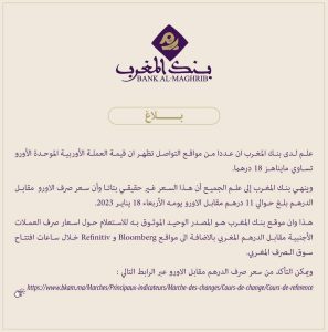 وقال البنك في بلاغ بهذا الخصوص، إنه علم بأن عددا من مواقع التواصل تظهر أن قيمة العملة الأوربية الموحدة الأورو تساوي ما يناهز 18 درهما، مؤكدا أن هذا السعر غير حقيقي بتاتا، وأن سعر صرف الأورو مقابل الدرهم بلغ حوالي 11 درهم يومه الأربعاء 18 يناير 2023.