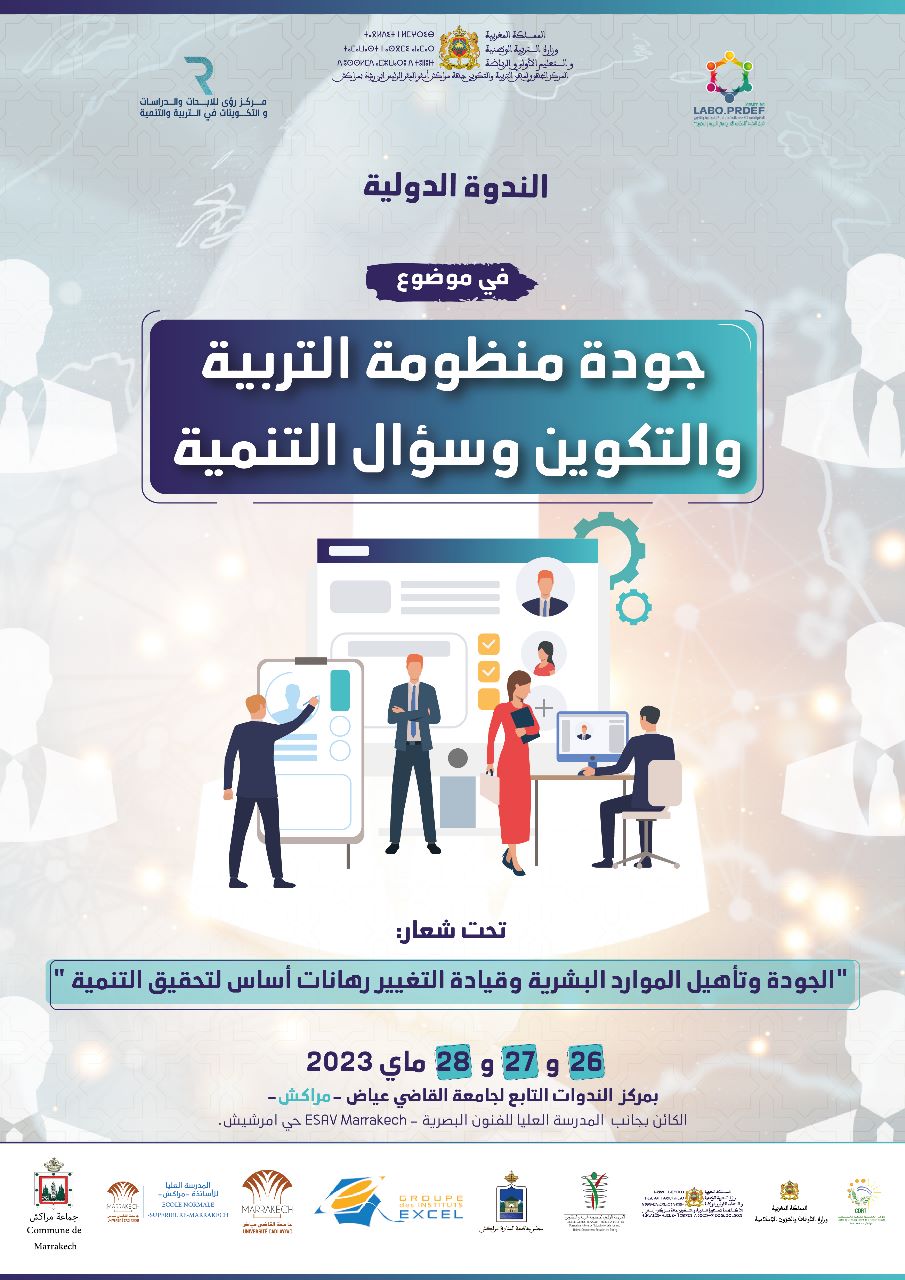 نظم المركز الجهوي لمهن التربية والتكوين بجهة مراكش اسفي ندوة دولية في موضوع: ” جودة منظومة التربية والتكوين وسؤال التنمية ” ، بتنسيق وتعاون مع فريق البحث “الحكامة الادارية في التربية والتكوين” التابع للمختبر المتعدد التخصصات للبحث في الديداكتيك والتربية والتكوين، بالمركز الجهوي المهن التربية والتكوين بجهة مراكش اسفي، ومركز رؤى للأبحاث والدراسات .