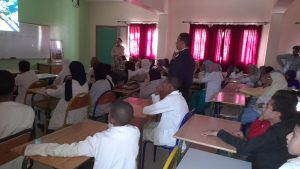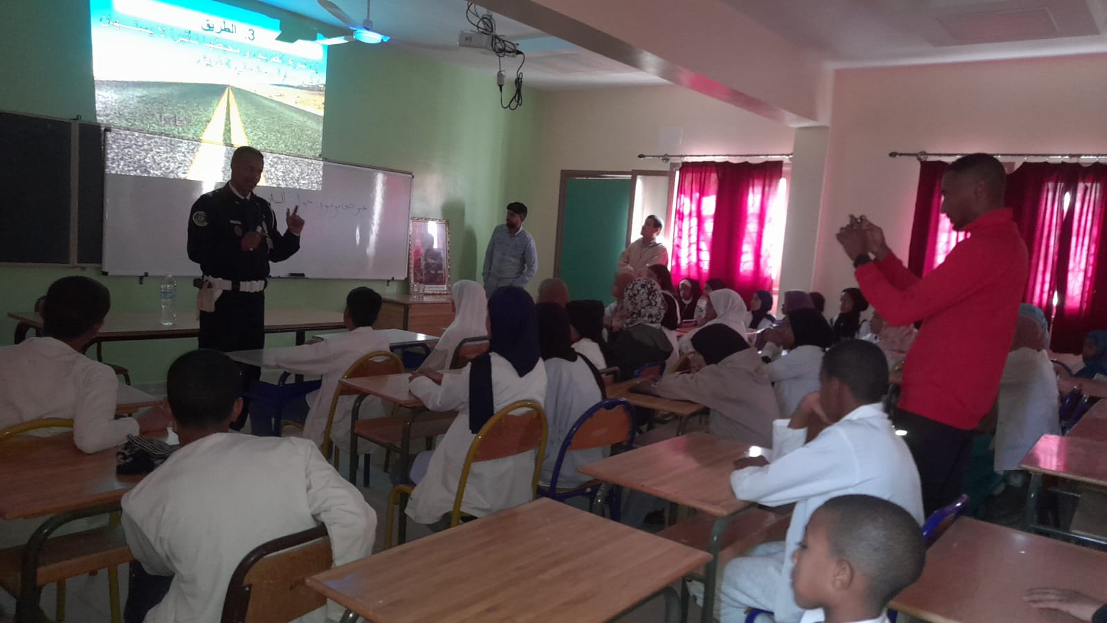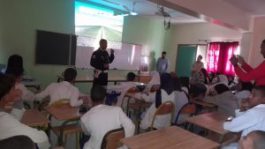إشارات المرور وكيفية التعامل مع الطريق راجلين او سائقي الدرجات ،كما تم تنبيه المتعلمين إلى عدم اللعب بالشارع لأن بمثل هذه السلوكات يعرضون انفسهم للخطر .وقدم رجال الامن مجموعة من الاحصاءات الخاصة بحوادث السير داخل المجال الحضري بالاقليم موضحين ان اغلب الحوادث سببها عدم احترام قانون السير من طرف الراجلي والسائقين على حد.