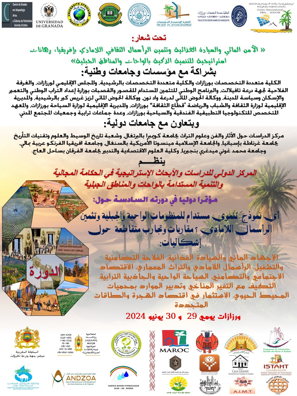 ستحتضن ورزازات مؤتمر دولي يومي 29و30 يونيو 2024، تحت شعار “الأمن المائي والسيادة الغذائية وتثمين الرأسمال الثقافي اللامادي بإفريقيا، رهانات استراتيجية للتنمية الذكية بالواحات والمناطق الجبلية”.