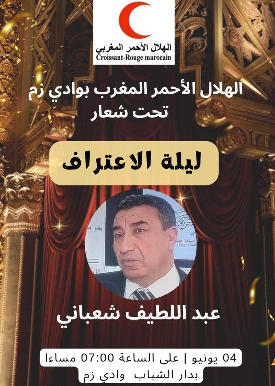 ينظم الهلال الأحمر المغربي بوادي زم اليوم الثلاثاء 04يونيو الجاري بدار الشباب ليلة الاعتراف بجهود فعاليات مدنية بمدينة وادي زم ، ويعتبر الأستاذ الإعلامي والمربي عبد اللطيف شعباني واحدا من هؤلاء الذين تم تشريفهم بهذا التكريم ؛ وبالمناسبة أشكر الإخوة في الهلال الأحمر بوادي زم كل باسمه وصفته على هذالتكريم ، وأتمنى أن يكون مدخلا لمزيد من العمل الجمعوي الجاد ، وتكاثف الجهود لإعادة الدينامية والتجويد للشأن الثقافي والرياضي والبيئي والاجتماعي خدمة للمبادرات الجمعوية النبيلة ، بما يخدم المواطن في هذه المدينة المقاومة وادي زم.
