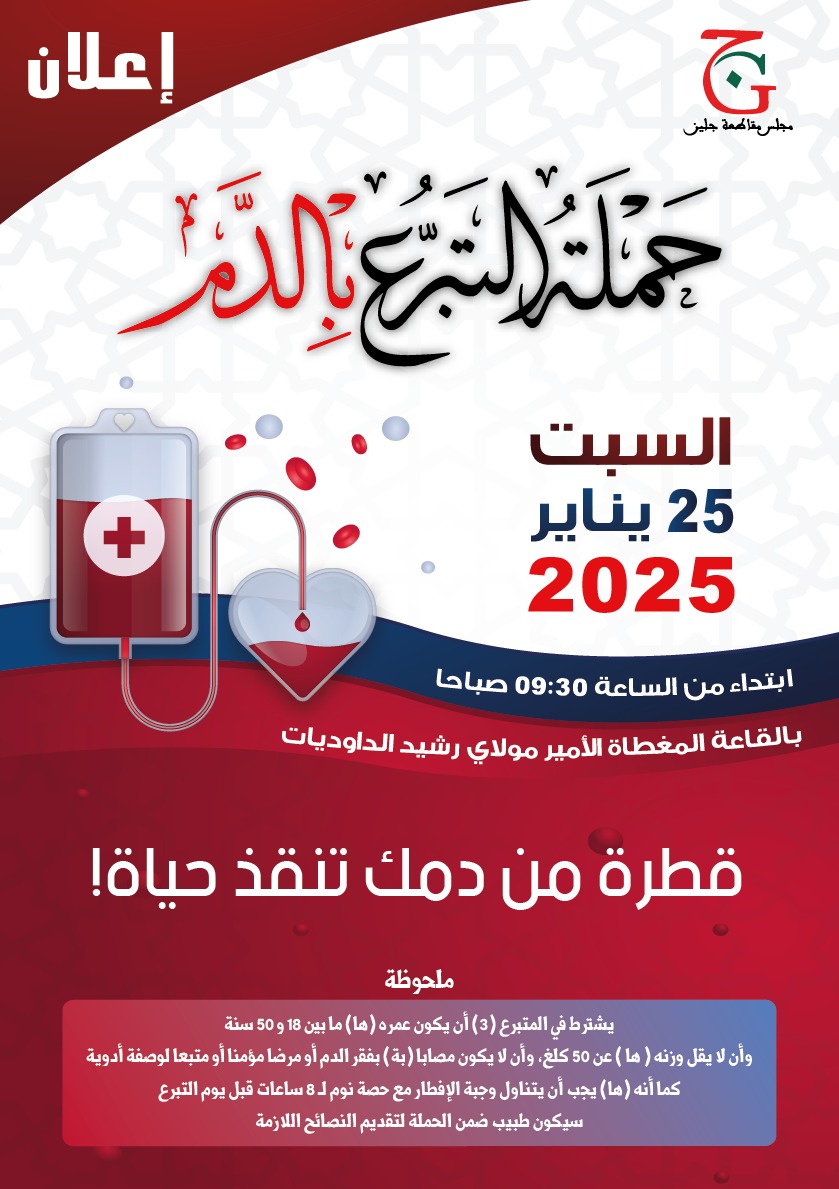 نظم مجلس مقاطعة جليز برئاسة السيد عمر السالكي بتنسيق مع المركز الجهوي لتحاقن الدم تحت شعار:” قطرة من دمك تنقذ حياة ” اليوم السبت25يناير2025 بالقاعة المغطاة مولاي رشيد بالداوديات بمراكش .