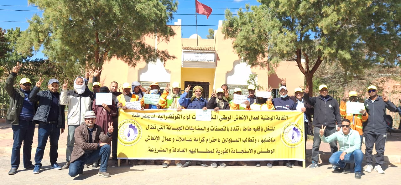 جسدت النقابة الوطنية لعمال وعاملات الإنعاش الوطني المنضوية تحت لواء الكونفدرالية الديموقراطية للشغل بطاطا، في وقفة إنذارية أمام مندوبية الإنعاش الوطني بطاطا، عبرت فيها عن رفضها للحكرة والأوضاع التي يعاني منها عمال الإنعاش الوطني عامة والعاملين في ورش النظافة خاصة طيلة سنوات خلت.