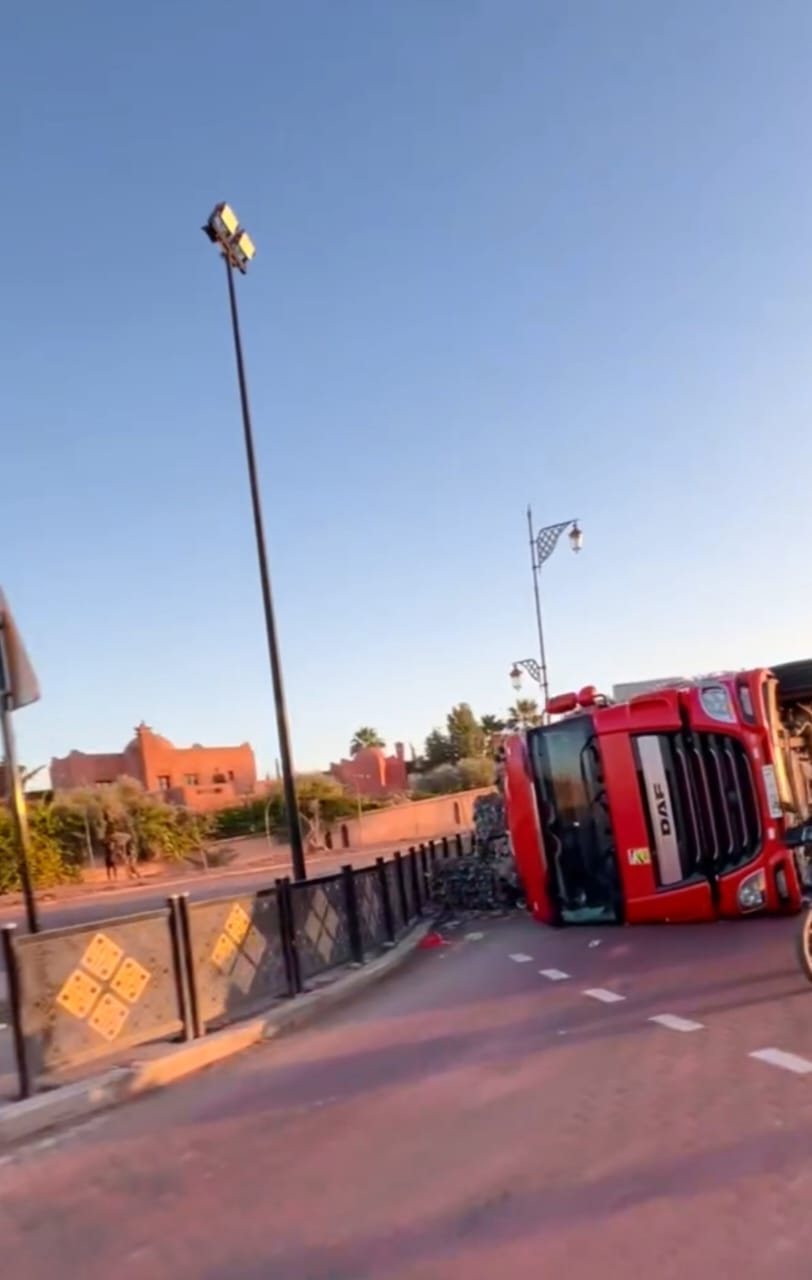 شهدت مدارة قرب مدخل مدينة مراكش، بتراب جماعة واحة سيدي إبراهيم، مساء اليوم فاتح دجنبر، حادث انقلاب شاحنة كبيرة، ما تسبب في ارتباك واسع لحركة السير وتعطّل جزئي للمرور بمحيط الحادث.