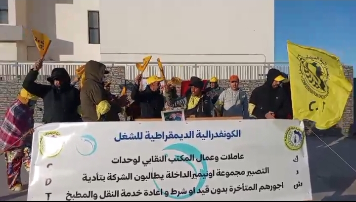 لشهر واحد واغلبيتهم من توقفت اجورهم ثلاث اشهر على التوالي في ظل صعوبة المعيشة والالتزامات الأسرية والاجتماعية ورغم محاولات التدخل لدى ادارة المجموعة لإيجاد حل عادل ومشرف يصون كرامة العمال والعاملات الذين افنوا زهرة شبابهم في خدمة المجموعة. الا أننا نواجه بالصمت والتجاهل كما ندين توقف خدمة النقل لمدة ثلاث اشهر مند 2025/10/31. وحيت ان العاملات والعمال يعانون الأمرين من غياب خدمة المطبخ باعتبارها خدمة مكتسبة منذ نشأة هذه الوحدة الانتاجية وهو التوقف الذي ثم دون تقيم مبررات مقنعة وحيث أن العاملات والعمال يشتغلون مدة 12 ساعة وهو ما يستحيل معها الاستمرار في الشغل دون فترة الاستراحة والغداء”.