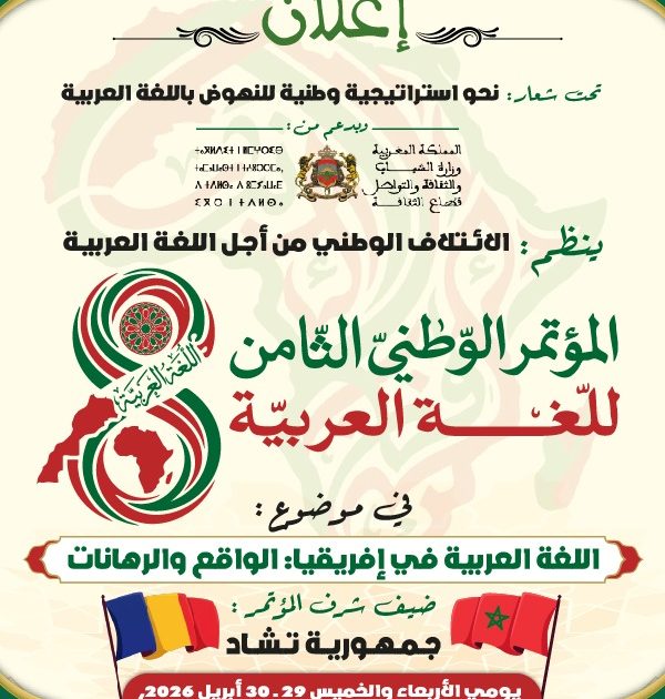 ينظم الائتلاف الوطني من أجل اللغة العربية، يومي الأربعاء والخميس 29 و30 أبريل 2026 بالرباط، أشغال المؤتمر الوطني الثامن للغة العربية، تحت شعار: “نحو استراتيجية وطنية للنهوض باللغة العربية”، وبمشاركة عدد من المؤسسات الوطنية والدولية.