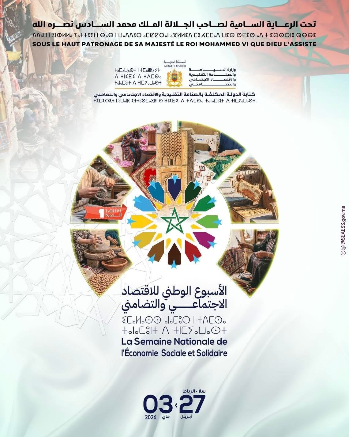 ستنطلق فعاليات الأسبوع الوطني للاقتصاد الاجتماعي والتضامني، الذي تنظمه كتابة الدولة المكلفة بالصناعة التقليدية والاقتصاد الاجتماعي والتضامني، تحت الرعاية السامية لصاحب الجلالة الملك محمد السادس، بكل من الرباط وسلا، تحت شعار: “الاقتصاد الاجتماعي والتضامني بالمغرب: آفاق جديدة لحكامة شاملة ومجالية مستدامة” يوم الثلاثاء 28 أبريل الجاري .